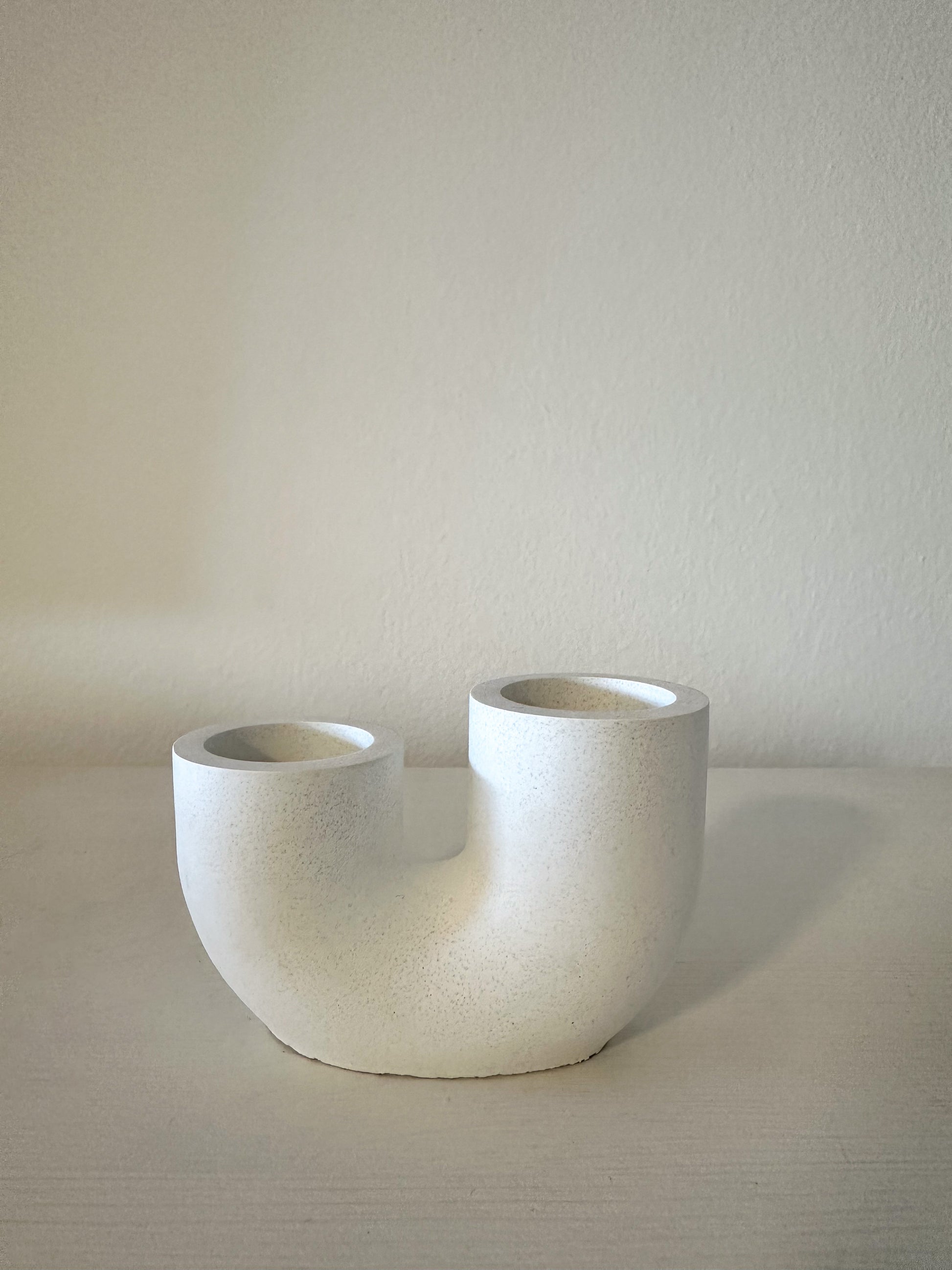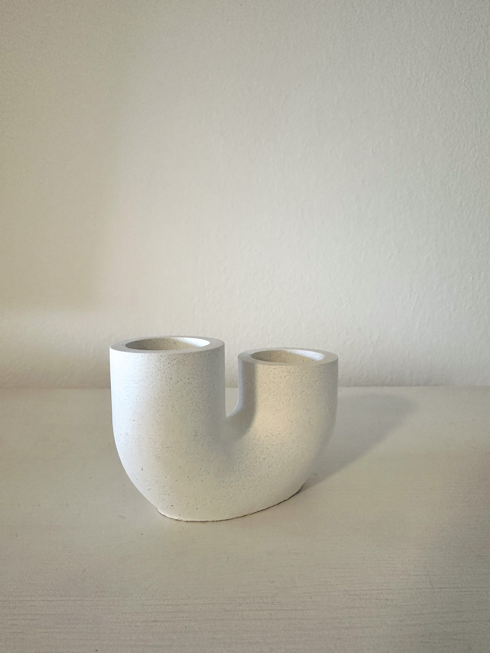 Un candelabro elegante y artesanal, diseñado para sostener dos velas largas y crear un ambiente cálido y acogedor en cualquier espacio. Hecho a mano en cemento con arena de cuarzo, combina resistencia y un estilo atemporal que encaja tanto en mesas de comedor como en rincones especiales del hogar.