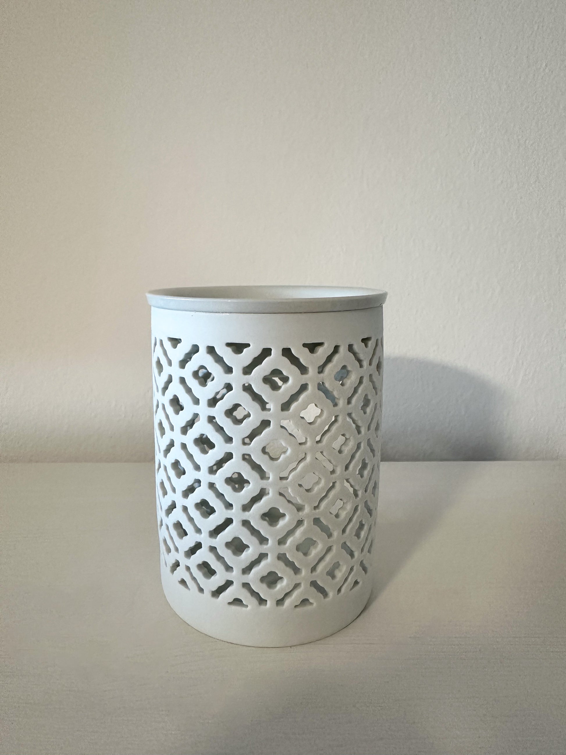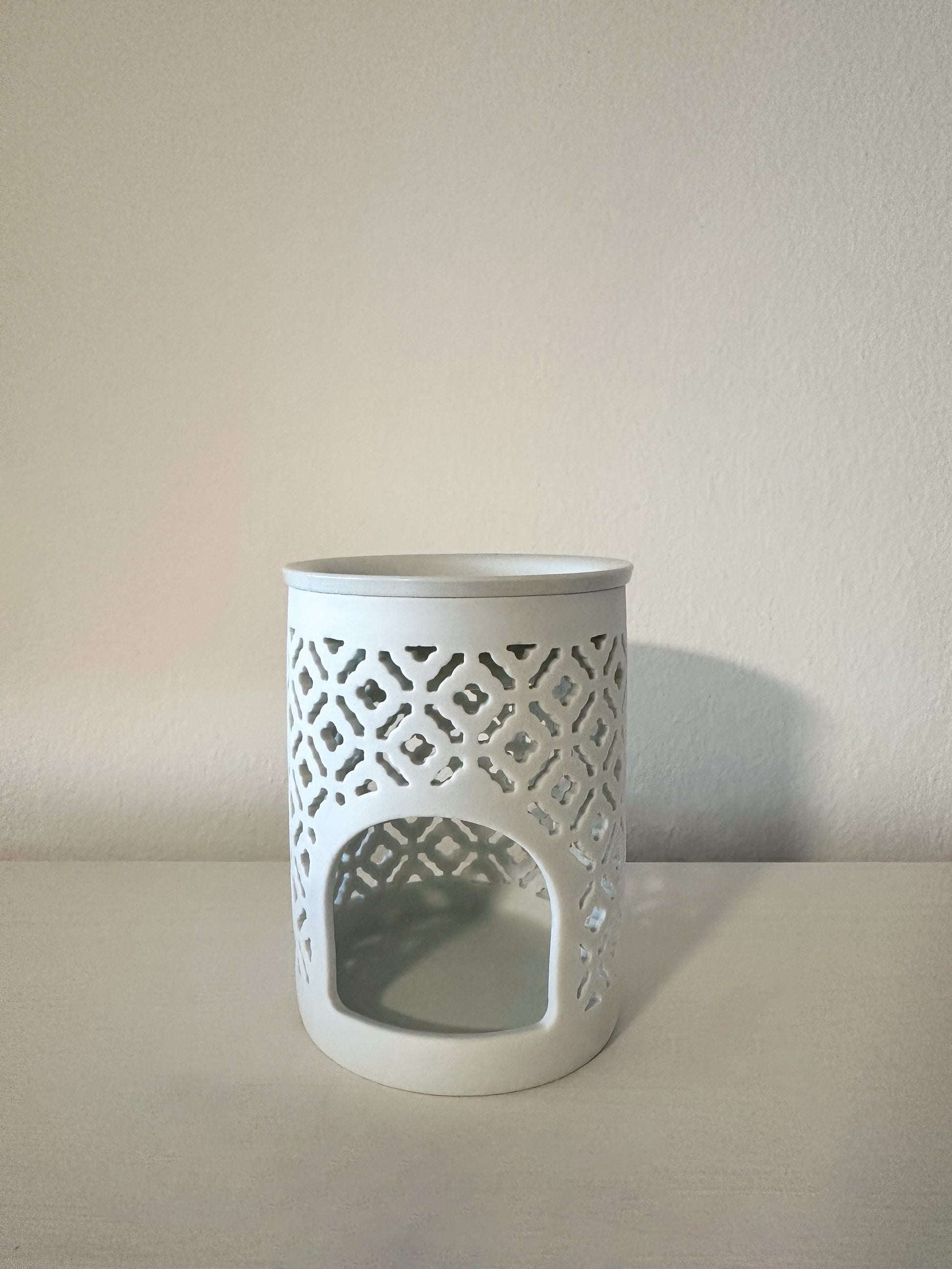 Quemador de cerámica con diseño calado. La luz de la vela crea un patrón de sombras acogedor mientras derrite el wax melt de forma uniforme.