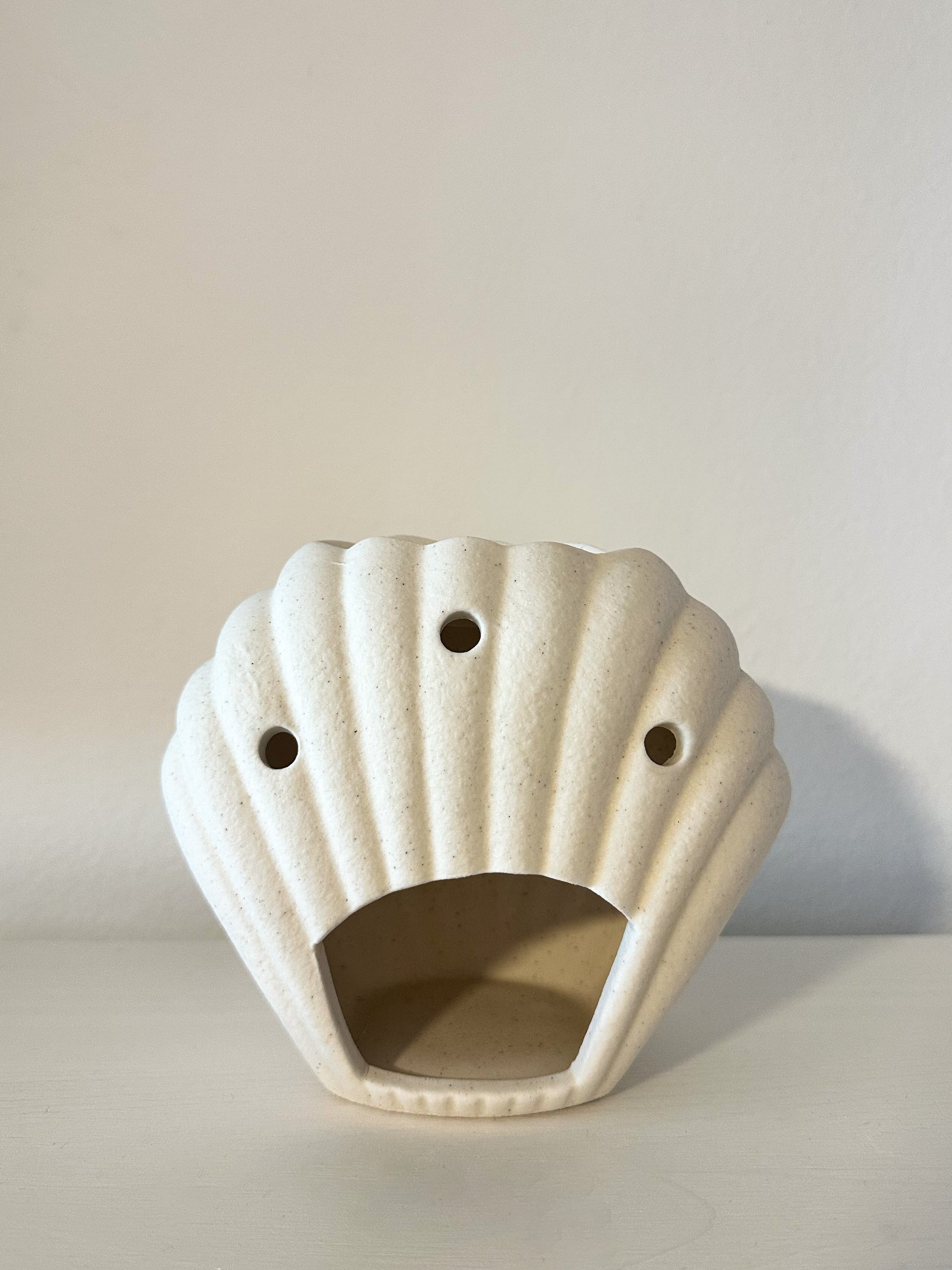 Quemador con forma de concha marina. Aporta un toque mediterráneo y suave, perfecto para ambientes relajados.