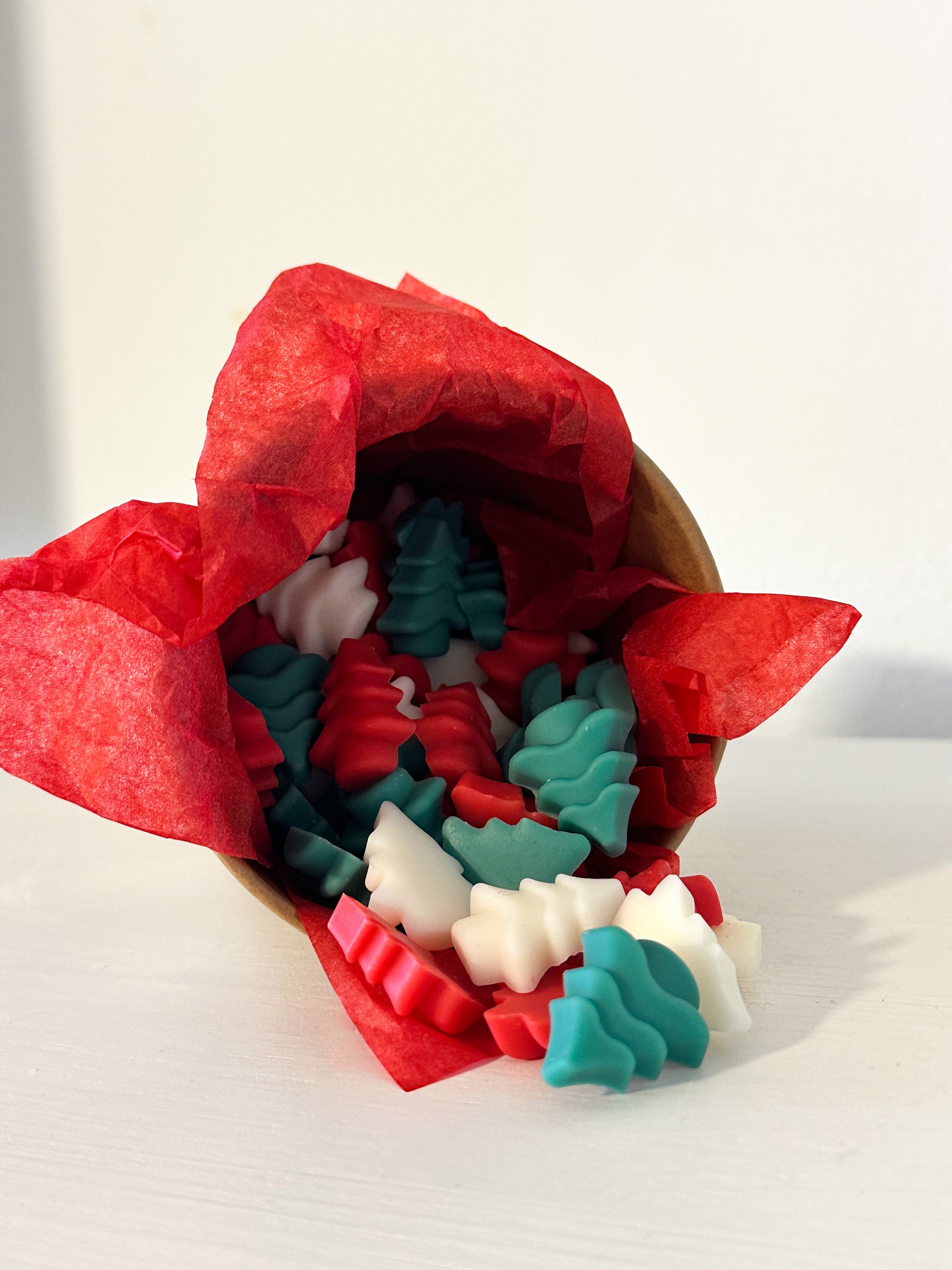 Árboles navideños hechos a mano en cera de soja vegana y libre de GMO. Vienen en tres colores — blanco, rojo y verde — para un mix perfecto de Navidad. Contenido: 100–110 g por caja.